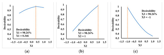 Optimal desirability for: (a) X1 factor, (b) X2 factor, (c) X3 factor.