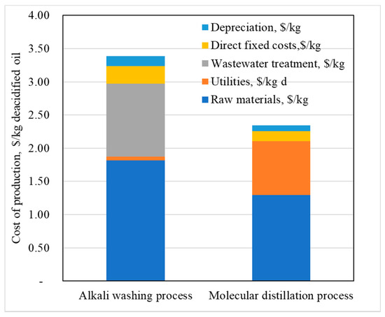 Production cost was evaluated as a contribution of variable costs (equipment, raw materials, utilities, and treatment costs), fixed costs (operating, non-operating and administration labor costs, land, and others) and depreciation costs (Figure 9). Raw material specific costs ($/kg deacidified oil) were 40% higher for the alkali process due to the consumption of alkali solutions, wastewaters, and solvents. Also, the variable costs for the alkali process were influenced by treatment. For the molecular distillation process, the higher contribution of production costs was given by raw materials and utility costs.