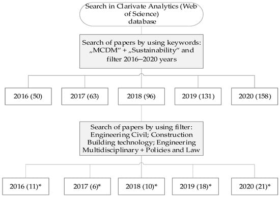 Multi-criteria decision-making (MCDM) application in the sustainability field has been constantly growing by presenting the potential of applying MCDM methods for sustainable decision-making in civil engineering, construction building technology, public environmental occupational health, social issues, and multidisciplinary engineering. In order to justify the backgrounds of this study and to emphasize its novelty, we conducted an analysis of scientific articles. The Clarivate Analytics (Web of Science) database was employed, aiming to elucidate the prevalence of the application of MCDM methods in construction-related scientific publications. Studies employing MCDM methods were identified and articles related to measuring, monitoring, and applying MCDM in the sustainability field were identified (Figure 1).