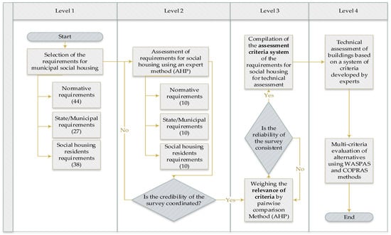 The first level is the development of a system of requirements for municipal buildings by normative documents, functions assigned to municipalities, and other needs of building residents assigned to buildings. One hundred and nine requirements were selected in the analysis of normative documents, municipal requirements, and the needs of the residents of social housing. A survey of 63 residents of social housing was conducted, with the aim to identify the requirements of social housing tenants.