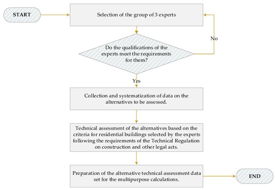 In the first stage, a group of experts consisting of at least three certified building experts, maintenance managers, or engineers with at least 10 years’ experience in construction were selected. These experts undertook an independent assessment of the designated buildings according to social housing requirements chosen by experts by the Technical Regulation on Construction [] and other normative acts, using the experience and the necessary standard testing methods.