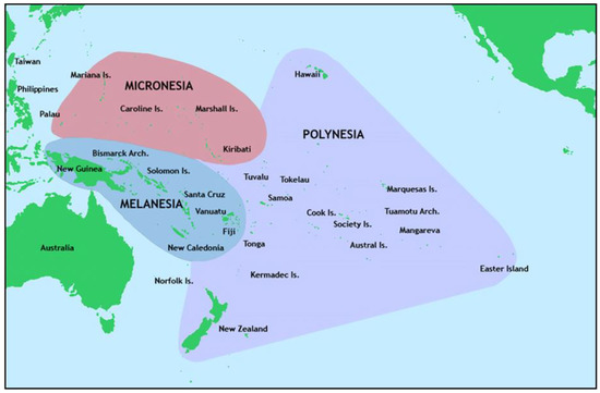 This research focuses on “Ocean Cities” in Oceania, defined here as urban settlements of the islands of Micronesia, Melanesia, and Polynesia, including Aotearoa New Zealand, together with the vast ocean areas between those islands (Figure 2). Ocean Cities are ones “where urban landscapes and seascapes meet, where built and natural environments near coastlines interface, and where human behavior and urban development have profound impacts on both terrestrial and marine ecosystems” [5] (p. 6).