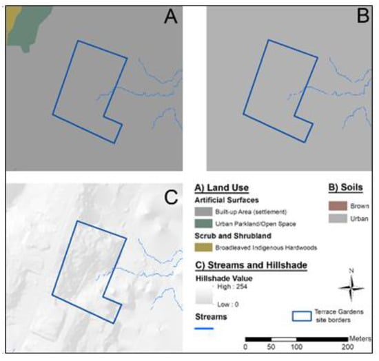 The baseline tool generates different layers based on the input provided. The Terrace Gardens site is entirely classified as “urban” for the soil type and “built-up area (settlement)” for the land use (Figure 6A,B). The site has a steep slope going down from west to east as illustrated by the dark grey value of the Hillshade layer (Figure 6C). The three streams start flowing on the downhill side (east) of the Terrace Gardens. Only one of them initiates in the site. These streams were simulated by LUCI through the DEM input data and thus indicate where water would likely flow during high rainfall events, rather than where permanent actual streams exist. The model likely had the capacity to model the Terrace Gardens more accurately with more spatially precise input data, but that required either better mapping of generic data (which is in some cases happening due to improvements in satellites, drones, etc.) or bespoke mapping efforts.