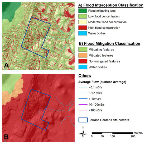 The LUCI analysis in terms of one individual ecosystem service tool, flood mitigation, reveals that the Terrace Gardens site lacks flood mitigating features (Figure 7B). The flood interception classification (Figure 7A) describes the area (in red and a 1m resolution) were water holding capacity and infiltration capacity are low and may be causing high flow concentrations. The flows of water that would occur in heavy rainfall events are low (<1 m3/s) because the site is the source of them.