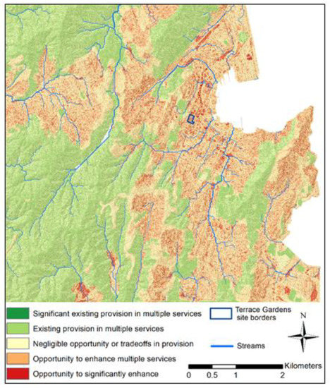 LUCI’s application in locations where the tool has never been used is more time consuming (up to several months) but the developer team has presented different options for parameterisation in a case study in the Philippines [71]. The tool does not yet report uncertainty, or consider supporting or cultural ecosystem services, but it is constantly evolving with ongoing research, for example, for urban application in Christchurch, New Zealand [45]. The pilot study for Wellington, Aotearoa New Zealand, conducted during this research supports the conclusion that LUCI is already somewhat relevant to urban design contexts and could be reasonably easily modified to become more so (see Section 3.4).
