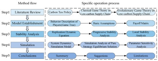 In this article, we first classify and summarize the literature in the low-carbon supply chain related fields. Secondly, the behavior of the three players in the game is described and assumed, and then the profit matrix is derived. Then we construct an evolutionary game model and do an asymptotic stability analysis and a local stability analysis. Subsequently, the system dynamics simulation model is constructed, and the sensitivity analysis of the parameters affecting the player’s strategy choice is also carried out. Finally, we draw conclusions and give recommendations, as shown in Figure 1.