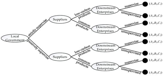 In this paper, we consider a two-level supply chain structure composed of upstream suppliers and their downstream enterprises, and also consider the role of local governments in monitoring suppliers’ low-carbon behavior. For the government, there are two strategies to strictly supervise the carbon emission reduction behavior of suppliers (A1) and passively supervise the carbon emission reduction behavior of suppliers (A2). For suppliers, there are two strategies—producing low-carbon products (B1) and producing common products (B2). For downstream enterprises, there are two strategies for participating in the supervision of suppliers’ carbon emission reduction behavior (C1) and not participating in the supervision of suppliers’ carbon emission reduction behavior (C2). Thus, the three-party game strategy game tree of local government, suppliers and downstream enterprises is constructed as shown in Figure 2.