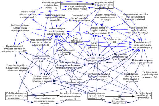In this paper, the evolutionary game model among local governments, suppliers and downstream enterprises is constructed by using game theory method; the replication dynamic equation of the tripartite game subject is obtained and both its asymptotic stability and local stability are explored in detail. In addition to this, the system dynamics model is used to simulate the evolution path and analyze the sensitivity of the parameters that affect the strategy selection of each player. The results show that the success rate of downstream enterprises’ supervision is closely related to the decision-making of the three parties. Both local government decision-making and supplier decision-making will be affected by the local government’s penalty coefficient. The supplier’s compensation to the downstream enterprises not only encourages the suppliers to produce low-carbon products, but also promotes the downstream enterprises to participate in the decision-making of supervision. When the local government strictly supervises and the suppliers adopt the strategy of producing low-carbon products, the final evolutionary strategy is not to participate in the supervision, regardless of the initial willingness of downstream enterprises to participate in the supervision. Based on the analysis results, we give the following suggestions:
