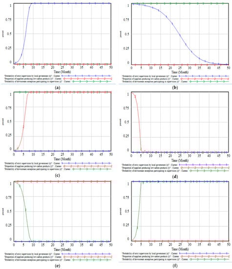 - When the initial state of the local government strategy is in space V2, as shown in Figure 3e, x = 0 is the stable point. Therefore, when the environmental governance costs of local governments are relatively large and the probability of suppliers producing low-carbon products is relatively small, or the environmental governance costs of local governments are relatively small and the probability of suppliers producing low-carbon products is relatively large, local governments will choose a passive regulatory strategy. No matter the suppliers produce low-carbon products or ordinary products, the degree of environmental pollution is relatively light or heavy. Local governments have relaxed their environmental supervision out of consideration of economic benefits, so local governments will choose strict supervision strategy.