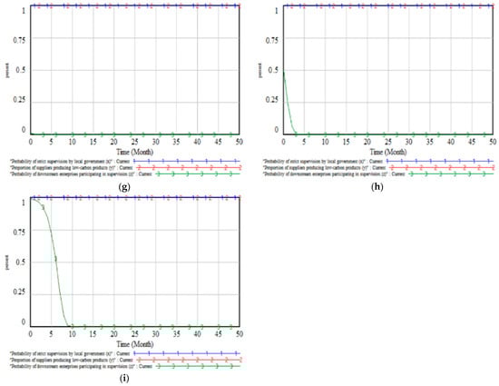 For the pure strategy equilibrium solution E7 (1,1,0), when the initial willingness of the local government and the supplier do not change and the willingness of the downstream enterprises to participate in supervision suddenly changes from 0 to 0.01, the simulation finds that its participation in supervision will drop to 0 rapidly, as shown in Figure 7g. As a result, we continue to change the initial willingness of downstream enterprises to perform simulations. When their initial willingness to participate in supervision suddenly changes to 0.5, its value will drop rapidly as time evolves, and it will drop to 0 in the third month, as shown in Figure 7h. Then the simulation of E8 (1,1,1) is carried out, when the willingness of downstream enterprises to participate in supervision suddenly changes from 1 to 0.99, its value will gradually drop to 0. Therefore, when local governments strictly supervise and suppliers produce low-carbon products, regardless of the initial willingness of downstream enterprises to participate in supervision or not, downstream enterprises will eventually choose not to participate in supervision over time.