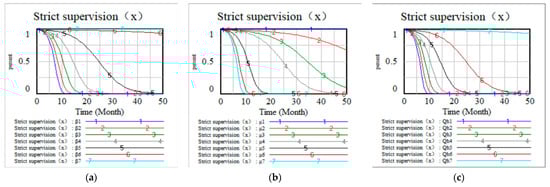 Curves 1–7 in Figure 8a represent the rate of change corresponding to x when β is 1.8, 1.85, 1.9, 1.95, 2, 2.05 and 2.1, respectively. It can be seen that if the local government penalty coefficient increases within 2.5%, the local government tends to negatively regulate. At the same time, the change of β makes the probability of strict government supervision gradually decrease. The smaller the β is, the faster x decreases and the larger the β is, the more it promotes strict supervision by the local government, which shows that the increase in the value of the local government penalty coefficient can effectively stimulate the local government’s willingness to strictly supervise. In Figure 8b, μ1–μ7 are 0.15, 0.18, 0.19, 0.2, 0.25, 0.3 and 0.33, respectively. The simulation found that when the success rate of downstream enterprises’ supervision is reduced within 10%, it will prompt the local government to negatively supervise. When μ is 0.15, the local government will adopt strict supervision strategy and, when μ > 0.18, the local government’s willingness to adopt a strict supervision strategy will become smaller and smaller. Where the larger μ is, the faster the rate of x decreases. Figure 8c shows the change of x when Q0 is 8 and Qh takes 7 values in 11.5–12.2 respectively. It can be seen from the figure that, when carbon emissions are controlled to increase below 2%, local governments will not strictly supervise them. As the carbon emissions of ordinary products produced by suppliers increase, local governments are more inclined to strictly supervise their carbon emission reduction activities. Among them, when Qh > 12.5, the probability of strict supervision by the local government will rise to 1.
