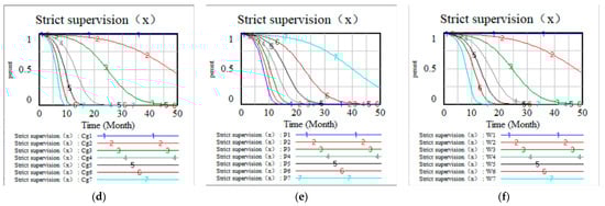 Figure 8d shows the influence of Cg1-Cg2 on x. Curves 1–7 are the corresponding changes in x when Cg2 is equal to 3 and Cg1 is equal to 6.8, 6.9, 7, 7.2, 7.4, 7.6, and 7.8 respectively. Studies have shown that when the cost of strict supervision is reduced to less than 7%, local government will stabilize in strict supervision. By comparing curves 1 and 2, it can be seen that when the difference between Cg1 and Cg2 is 3.8, the local government adopts strict supervision strategy. When the difference is greater than 3.8, the local government’s willingness to strictly supervise gradually decreases, as shown in curve 2–7. The greater the difference between the cost of strict supervision and passive supervision by local governments, the more they tend to adopt passive supervision strategies. In Figure 8e, P1–P7 are 1, 1.5, 2, 2.5, 3, 3.5 and 4, respectively. The higher the reward from the government when the downstream enterprise is successfully supervised, the stronger the willingness of the local government to strictly supervise. W1–W7 in Figure 8f are 22.8, 22.9, 23, 23.1, 23.2, 23.3 and 23.5, respectively. When W is 22.8, the local government strictly supervises. When W > 22.8, the probability of local government strict supervision gradually decreases. The larger W is, the faster x decreases. This indicates that when environmental governance costs are controlled within a certain amount, local governments are acceptable and will choose strict supervision but when environmental governance costs exceed a certain amount, local governments will be more and more willing to ignore environmental losses and choose passive supervision.