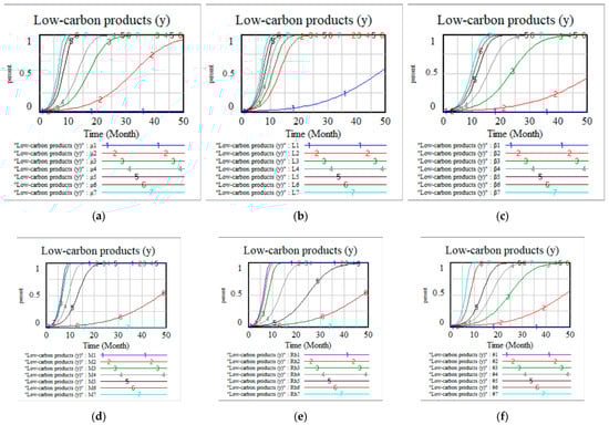 M1–M7 in Figure 9d are 29.9, 30, 30.5, 30.8, 31, 31.3, and 31.5 respectively. The image shows that the cost of reducing emissions is controlled within 5% and suppliers will choose to produce low-carbon products. The trend of the curve in the figure indicates that the smaller M is, the greater the probability of suppliers producing low-carbon products, indicating that within the controllable range, a smaller investment cost for emission reduction can provide an incentive for suppliers to produce low-carbon products. Figure 9e plots the impact of the difference in market revenue between suppliers producing low-carbon products and ordinary products on y and the seven curves are 7 values in 182.2–183.2 respectively when Rl is fixed at 150. The simulation shows that the smaller the difference between Rh and Rl within a certain range, the more inclined suppliers are to produce low-carbon products. Figure 9f shows the impact of the carbon tax rate (θ) on the supplier’s strategic choice, and curves 1–7 represent that θ is 9.7, 9.8, 9.9, 10, 10.1, 10.2 and 10.3 respectively. Suppliers tend to produce low-carbon products when the carbon tax rate is controlled to be reduced to less than 3%. When θ > 9.8, the supplier tends to choose to produce low-carbon products. Every 0.1 change in θ will have a great impact on the probability of suppliers producing low-carbon products. The greater the θ, the more sensitive the supplier’s response to product low-carbon products, which indicates that the carbon tax rate (θ) has a more compulsory constraint on whether suppliers produce low-carbon products.