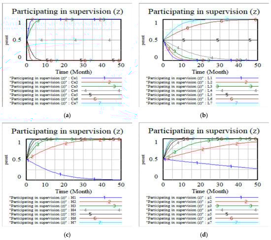H1–H7 in Figure 10c are 1, 1.2, 1.4, 1.5, 1.7, 1.9, and 2, respectively. When the supplier’s loss of consumer repeat customers is more than 20%, the willingness of downstream enterprises to participate in supervision will gradually rise and eventually stabilize 1. When H is 1, the consumer repeat customers lost by downstream enterprises are not enough to attract the attention of downstream enterprises, so downstream enterprises choose not to participate in supervision. When H > 1, the loss is related to the fundamental interests of downstream enterprises, which has attracted the attention of downstream enterprises. Therefore, the probability of downstream enterprises choosing to participate in supervision is gradually increasing, and the larger H is, the faster z will rise. In the same way, the success rate of downstream enterprises’ supervision has also played a certain role in motivating whether they participate in supervision. Curves 1–7 in Figure 10d represent μ as 0.14, 0.15, 0.16, 0.18, 0.2, 0.22 and 0.24, respectively. Figure 10d shows that when the success rate of supervision of downstream enterprises decreases by more than 25%, downstream enterprises will choose not to participate in supervision. When μ is 0.14, the success rate of supervision at this time is too small, and downstream enterprises will not take the risk of choosing to participate in supervision; but when μ > 0.14, downstream enterprises may choose to pay a certain supervision cost to choose supervision, such as curve 2; as μ gradually increases, the probability of downstream enterprises choosing to participate in supervision is increasing, indicating that downstream enterprises are willing to pay for rewards or compensation to monitor suppliers’ carbon emission reduction behavior.