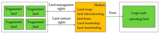 In September 2015, the General Office of the Hebei Provincial Committee of the Communist Party of China and the General Office of the Hebei Provincial People’s Government formulated the “Implementation Opinions on Guiding the Orderly Transfer of Rural Land Management Rights to Develop Agricultural Appropriate Scale Operation,” which stipulated land transfer in Tai-hang Mountain in Hebei in terms of policies [36]. At present, Tai-hang Mountain in Hebei mainly carries out land transfer through land exchange, land lease, and land subcontracting [36]. The specific operation mode of land transfer is shown in Figure 1. Combined with current local conditions, the diversity of land transfer modes is conducive to the optimal use of local land resources and maximizes the current benefits of the land [37]. In summary, the effectiveness of land transfer in Tai-hang Mountain is mainly reflected in the following aspects: Firstly, land transfer enables optimal allocation of rural resources to the greatest extent. Secondly, land transfer has changed the traditional agricultural organization and production and management modes. Through land transfer, land-use rights are transferred from self-employed persons to large households, cooperatives, and local characteristic agricultural enterprises. In this process, the transfer of land-use rights is accompanied by advanced management concepts, production technology, and capital injection, which gradually changes the traditional and backward land production mode of self-employed persons, and is replaced by a modern, large-scale, and benefit-oriented production and operation mode. Thirdly, land transfer has liberated rural productivity, enabled farmers to master key technologies, and ultimately increased their income.