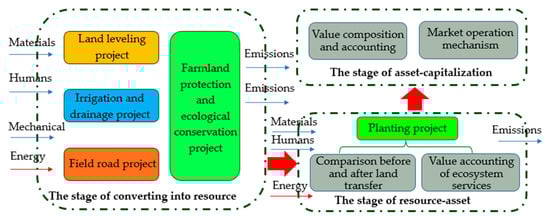 Since the land-use type before the land transfer is wasteland, according to the implementation status of land transfer, the stage of converting it into resource mainly includes the construction status of the project before the second use of the land after land transfer, which mainly includes 4 parts: a land leveling project, an irrigation and drainage project, a field road project, and a farmland protection and ecological conservation project. Through these projects, the land is renovated so that the land can fulfill the purpose of crop planting. The stage of resource–asset is reflected by planting crops on cultivated land under the premise of detailed property rights, and at the same time, reveals the value changes of ecosystem services. The stage of asset–capitalization is the result that causes value appreciation, mainly including value composition and accounting. Figure 2 shows the system boundary of the resource capitalization process under land transfer.