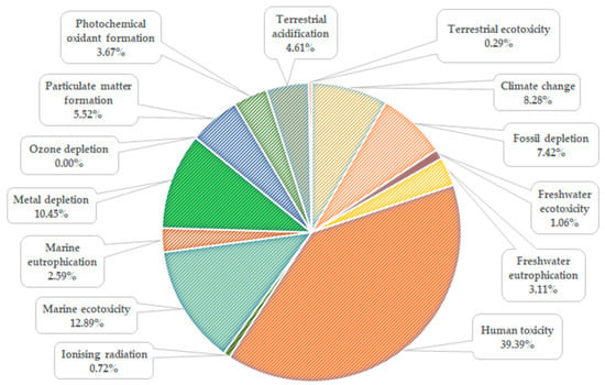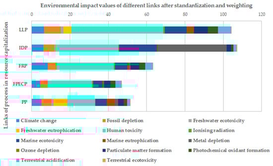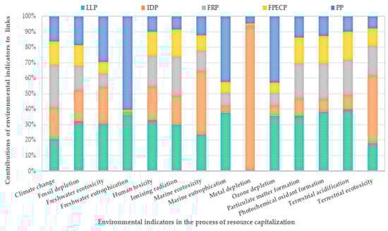 Figure 3 shows the contributions of the 14 environmental indicators on land transfer in the process of resource capitalization after standardization and weighting. After standardization and weighting, we compared the environmental impacts of different indicators on the whole process of resource capitalization. It can be seen that the six indicators that had the most significant impact on the whole process were Human toxicity, Marine ecotoxicity, Metal depletion, Climate change, Fossil depletion, and Particulate matter formation. The six indicators with the least significant impact were Ozone depletion, Terrestrial ecotoxicity, Ionizing radiation, Freshwater ecotoxicity, Marine eutrophication, and Freshwater eutrophication. Due to a variety of inputs causing different contributions of indicators to the overall environmental cost, we focused on the indicators that had the most significant impact on the environment to make it possible to explore corresponding measures to reduce the environmental impact.