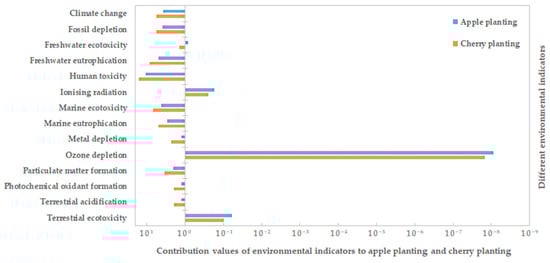 It can be seen from Figure 6 that after land transfer, different crops had different impacts on environmental indicators. After land transfer, apple planting had the most significant impact on Human toxicity, followed by Freshwater eutrophication and Marine ecotoxicity. The contribution of cherry planting to environmental indicators also showed a similar trend. By converting the apple planting area and cherry planting area to the same unit and comparing the environmental impact between them, it could be seen that, as a whole, the impact of cherry planting on the environment was higher than that of apple planting, and all environmental indicators showed this trend.