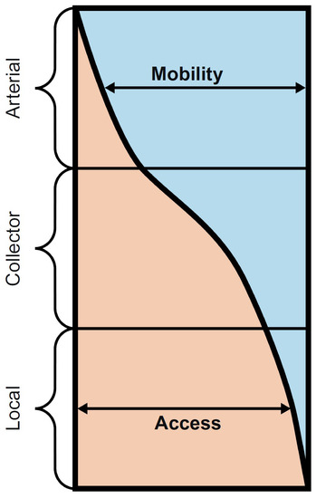 The necessity of dividing the road network of a state, region, or province in various levels is subjected to the functions that the road network have to fulfill. These functions are mobility and accessibility. Mobility is the property that evaluates the number and quality of the trips, taking into account the traffic volume and the speed or travel times. A quick, comfortable and safe circulation is aimed to provide. On the other hand, the accessibility is the property that measures the easiness to access any part of the territory, allowing to reach any inhabited location. These functions are competing objectives. Whereas in a road that prioritize mobility impediments to the traffic flow should be minimized, roads providing access to adjacent land uses have more frequent access points [2,3]. The compromise between mobility and accessibility influences the operation and the safety of the roads; hence, the network or any road should be planned carefully, according to their function or functions. Each type of road has a vital role for developing a well-operating and efficient network with the aim of facilitating higher-speeds in long-distance travels and lower speeds in short-distance trips. In general terms, roads can be classified in arterials, collectors, and local roads, with a variable proportion of the functions (mobility and access); see Figure 1. Arterials represent the highest level of mobility and are focused on providing high-speed and uninterrupted flow. Long-distance travels are frequent in arterials. Collectors have a blended objective of maintaining mobility and access, facilitating the movement between local roads and arterials. Finally, local roads or streets provide direct access to residences, businesses, and other land uses. On local roads, speed can be minimized to provide more frequent accesses to adjacent lands [3].
