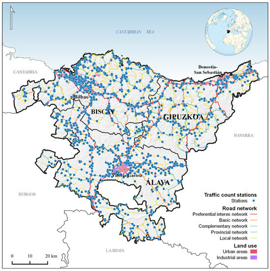 The Basque Autonomous Community is located in the northern part of Spain. It is composed by three provinces (Biscay, Gipuzkoa, and Álava), and it covers 7230 km. It has million inhabitants, of which 40% are concentrated in the Bilbao Metropolitan Area [37], which is also the area with most industry and most traffic. Each of the provinces have the ownership and competences over all the highways in its territory, including the main freeways and highways that communicate with other regions of Spain, except from the municipal streets [19,25]. The road agencies of each of the Regional Governments manages its own road networks and publishes annually the traffic data. In this research, those corresponding to 2019 were employed [38,39,40].