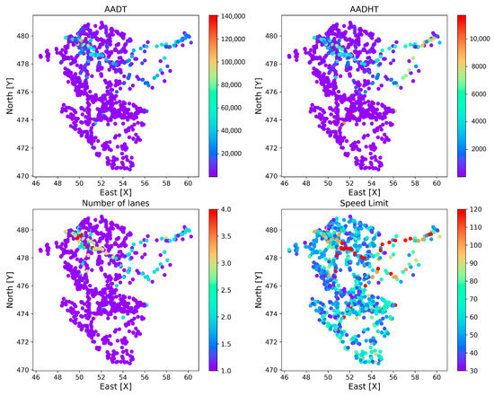 In Figure 3, all the measurements of the four variables in each station are visualized. As it has been indicated before, the highest values of the variables AADT and AADHT are concentrated in the northern region of the BAC in the East-West direction. The same happens with the categorical variable number of lanes. Once again, as higher volumes are registered in the roads connecting the major cities (Bilbao and Donostia/San Sebastián) and in their metropolitan area, more lanes are required in these areas. However, the speed limit variable is more homogeneous. This variable does not have peaks in the northern area because the AP-8 freeway connecting Bilbao and Donostia/San Sebastián have many segments with controlled speed, under 100 km/h and even under 80 km/h, due to the geometric design in this mountainous region. Similarly, urban freeways in the metropolitan areas of these two major cities have a maximum speed of 80 km/h in most of the segments.