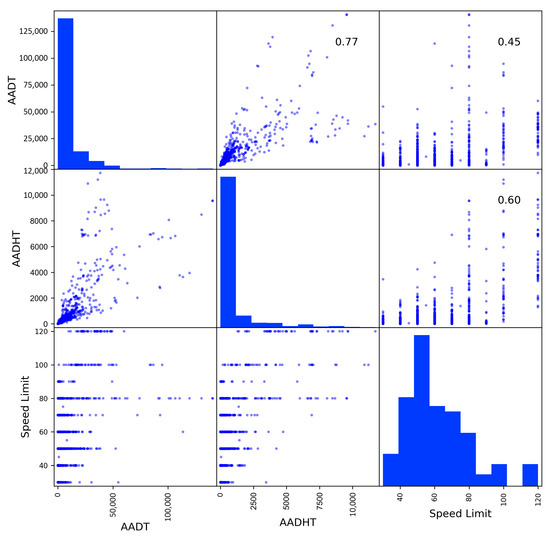 In the first stage, a statistical description of the data is performed. The correlation of the main variable of interest (the AADT) and the complementary variables (the AADHT, the number of lanes, and the speed limit) is also analyzed.