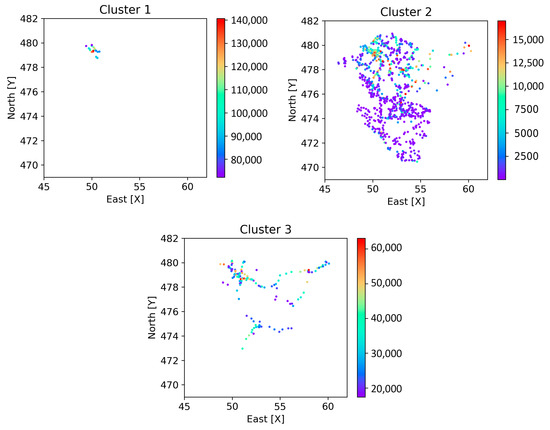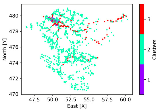 Due to the spatial arrangement of the clusters, it may happen that estimating in each of the clusters could cause an overlap. That is to say, the data are not efficiently grouped by location; they are mixed. This is evidenced when visualizing the three clusters in Figure 7. Although the grouping hypothesis is valid and contributes in estimation processes, in this case, it is not feasible to apply it given the lack of spatial distance between clusters.