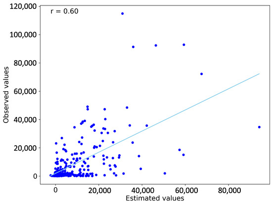 - Fifty executions have been performed. The linear correlation coefficient r of each execution has been calculated, which is used as an indicator of the precision of the estimation method. The obtained best value has been , the worst , and the mean . The results that correspond to are plotted on a scatter diagram; see Figure 9.