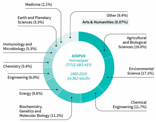 Scopus database. Documents by area, including the word ‘microalgae’ in the title, abstract, or keywords. Percentage of the total (24,362 results from 1960). Only 18 publications fall in the area of Arts and Humanities. Data as at December 2019.