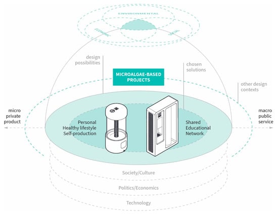 This research delves into the relationship between design and phycology—the study of algae—by trying to answer two questions: ‘Can the design discipline contribute to microalgal studies?’ and ‘How can design researchers contribute to foster the adoption of microalgae for food use?’ To date, there is no word to define the unusual investigation area between these two fields that are so far apart. However, this area of study is more a research and practice niche within sustainable design, especially biodesign—an emerging design approach based on science that integrates the use of living matter within products, structures, and processes [33]. Artists, architects, and designers continuously update themselves with the latest technologies and innovations, and over the decades, they have challenged the previously accepted limits with their works. Among the several nature-based solutions that have been adopted so far (biocement formed thorough bacterial metabolic activity [34], 3D bioprinting [35], and mycelium-based products and structures [36], to name a few), designers are increasingly experimenting with algae and microalgae, for instance, with large-scale installations, new product designs, furniture, innovative bioplastic packaging, and energy and food systems. Accordingly, multifaceted research domains are opening up. Due to their ease of cultivation, high yields, and the limited amount of water and land need to grow—microalgae could play a pivotal role in novel solutions for human food production in the upcoming decades. Designers and chefs are collaborating to create innovative and futuristic microalgae-production devices. They are also experimenting with tasty new recipes to make microalgae more palatable and slowly change consumers’ eating habits [37]. Microalgae could be useful not only on Earth but also in space. A new era of space exploration is upon us, and the colonization of other planets would require new approaches to design and food production. NASA is already working on this topic with designers and scientists [38].