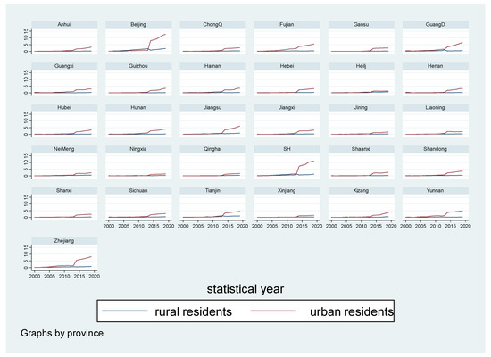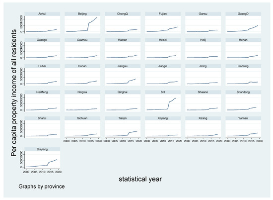 Undoubtedly, the property income of rural residents is a critical issue which the economic development and income enhancement policies should focus on. Considering its pulling effect in the sources of residents’ disposable income in recent years, we focus on analyzing the determinants and mechanism of Chinese residents’ property income, as well as the reasons for the slow growth of rural residents’ income. The per capita property income data of all residents in China’s provinces, municipalities, and autonomous regions (hereinafter referred to as “provinces” for short), from 2000 to 2019, according to the “China Statistical Yearbook”, are shown in Figure 1, and the unit is yuan RMB. For comparison, the per capita property income data of urban and rural residents in each province are shown in Figure 2, and the unit is one thousand yuan RMB. The various resident income data used in this article are actual values, that is, the value after adjusting the spatial price difference through the annual consumer price index of each province.