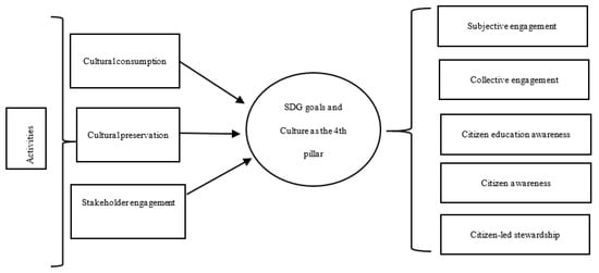 The three-pillar approach of sustainable development has traditionally focused attention on the role of environmental development, economic growth, and social inclusion. However, it failed to give due importance to cultural paradigms for societal growth [6]. In recent times, this ignorance has been rectified to some degree with the growing awareness of the need to recognise the role of cultures and cultural phenomena in sustainable development. For example, the new urban agenda 2016 emphasises the need for adopting culture-based approaches for urban planning and development. It highlights its role in bolstering local and regional identity and consequently in the protection of associated creative industries. According to a report on Culture for Urban Sustainable development [17], culture is posed as the inherent power to challenge barriers of urban development, namely, inequalities, violence, and insecurities by changing social mindsets about how people and communities in a given context should live, develop, and prosper. Culture-based development is now actively incorporated into several sustainable development goals (SDG, 2030) [18], such as SDG 11, 17, 8, and 4 (see Table 1).
