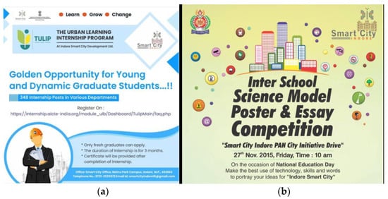 (a) Poster inviting applications for student internship positions in the Indore Smart City project [52]. (b) Competitions for engaging school students to engage with the Smart City Mission, Indore [52].
