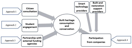 The clustering of stakeholders falls in line with Cova and Cova [32] who categorise consumers based on their innate relationship with products, services, and consumption-related practices. It is noted that while some stakeholders engage mainly through meetings with the governance bodies and contribute in surveys, discussions, and brainstorming sessions, others engage through their professional position or subjective interests in the built heritage conservation project. The strategy is seen to not only bring together citizens of all functional roles but also ensures that regional diversity is given due representation.