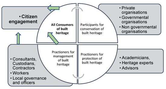 The efforts of the Indore Municipal Corporation to safeguard the cultural built heritage is based on the philosophy that “reusing heritage places also amounts to a substantial environmental and financial saving in embodied energy. It avoids the creation of waste and the need for replacement building materials” [48] (p. 7). The various approaches employed for protecting cultural heritage demonstrate a multi-layered, collaborative, and consensus-driven strategy with the citizens and local private and public institutions. It can be said that this culture-driven approach resounds the aspirations of the various identified sustainable development goals (SDGs 17, 11, 8, and 4) [18] for the protection and transformation of cities and communities. The empirical context emphasises the possibilities involved in the design and implementation of sustainable development plans to protect heritage-based ecosystems through social inclusion and diversity management. Analysis of the strategic approaches adopted by the Indore Municipal Corporation points to the use of a multi-layered stakeholder inclusion plan as the main tool to achieve the built heritage conservation. The participants of the built heritage drive comprised local citizens from varied demographic profiles such as students, managers, academicians, advisors, and consultants. Four clusters of participants emerge as critical to the inclusive approach: consumers of built heritage, practitioners for the conservation of built heritage, practitioners for the awareness of built heritage, and practitioners for the management of built heritage. These can be understood as key relationships, shown in Figure 6, that are pivotal to the strategic makeup of the inclusive approach for built heritage preservation.