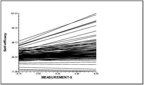 43]. The measurement variable was coded following the week when each survey was conducted, in weeks 1, 5, 11, and 14. The centering parameter for the coding was set at week 5 because this was the first survey conducted after the course had actually begun, so the baseline scores (M1) were different for the various participants. In addition, the centering also reduces collinearity between the linear and quadratic components [