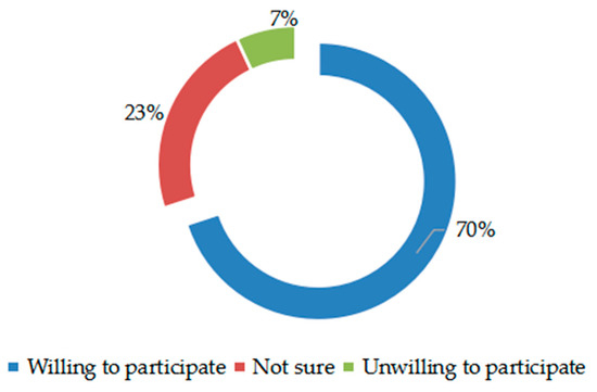 As shown in Figure 4, up to 70% of the residents expressed their willingness to participate in tourism development in Zhujiajiao ancient town. They are eager to get more rights to make decisions on tourism development and are willing to contribute to ancient towns’ construction. Only 7% of the respondents were reluctant to participate in community tourism, and 23% of the residents were not sure about it. From these data, it can be seen that residents of Zhujiajiao ancient town have a greater willingness to participate in local tourism development. Government and relevant departments should develop further strategies for the psychological and political empowerment for residents who have not expressed their support for community participation in tourism.