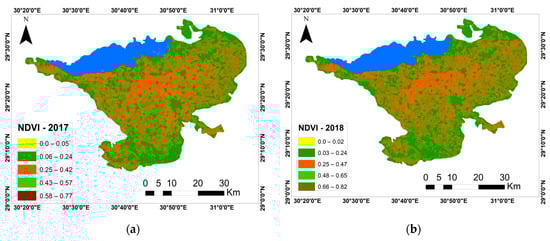 The NDVI was calculated on 10 August for four years (2017, 2018, 2019, and 2020). This index is a dimensionless index that reflects the presence and density of vegetation based on the simulated red and NIR reflectance, as shown in Equation (2).