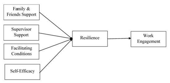 Employees develop resilience when they have the support of their family and friends, which consequently leads to work engagement. When employees do not have family and friends’ supports, they may experience work stress. Work stress, which can lead to work disengagement, is said to have a negative significant influence on employee resilience [64]. Research has shown that the buffer for employees to be able to endure chaotic situations is the support from friends and family. Increased resilience in employees indicates that employees will be able to avoid work burnout due to increased family and friends’ support [65]. This finding shows a connection between friends’ and family’s support, resilience, and employees’ work engagement. Family and friends’ support is a personal resource at home that influences personal resources at work, such as resilience, which leads to work engagement [66].