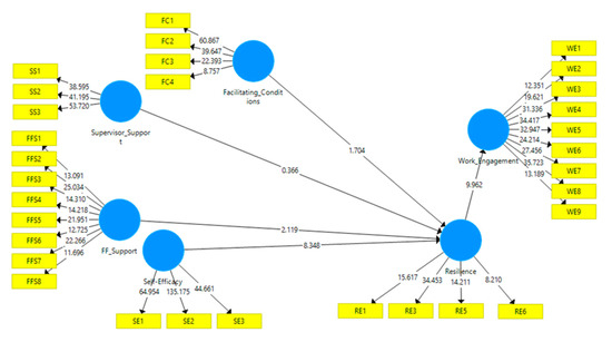 Figure 2 presents the generated PLS output of the measurement model. In addition to the reported Cronbach’s alpha values, we assessed the measurement model’s internal consistencies using the values of the composite reliability. The composite reliability values ranging from 0.818 to 0.968 indicate satisfactory internal consistency levels for all the constructs (see Table 1). Owing to low factor loading, we deleted an item from supervisor support (i.e., SS4) and two items from resilience (i.e., RE2 and RE4). Then we obtained factor loadings that were greater than the threshold value of 0.600 for all the constructs, except for one item from resilience with a value of 0.548. However, this item was retained because of the acceptable value of the average variance extracted (AVE). As shown in Table 1, the AVE values ranging from 0.534 to 0.909 are above the acceptable cutoff point of 0.50 [73]. Therefore, the conditions for convergent validity were satisfied.