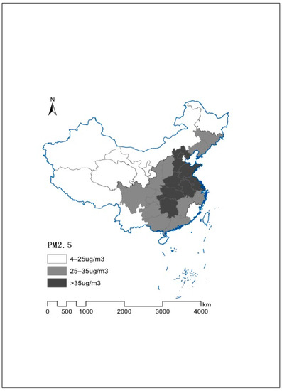 China, as the largest developing country in the world, has been experiencing tremendous economic growth accompanied by deterioration of air quality in recent decades. According to the Asian Development Bank Report (2012), of the 10 most polluted cities in the world, seven were in China. Air quality in China is largely affected by the structure and the intensity of economic activities [1,2]. As shown in Figure 1, regions with high PM2.5 (particles with a diameter below 2.5 µm) concentration are mainly located in the east, central, and northeast parts of China, which are the most economically developed areas in China.