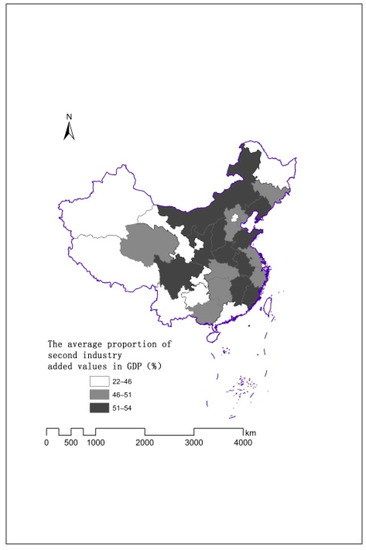 Average proportion of secondary industry added value in GDP (%). Data sources: China Urban Statistical Yearbook.