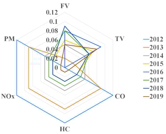 From the calculation results, it can be seen that in the 8 years from 2012 to 2019, the lowest sustainability level is in 2012 and the highest sustainability level is in 2016. The reason for the result of 2012 is that the main factors of freight volume and the turnover volume of freight are much lower than those of other years. Although this makes the pollution emission factors of 2012 very low, it is difficult to compensate for the impact of low volumes.