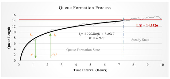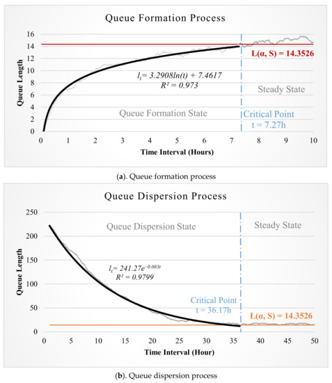 For the queue-formation state, it was found that the natural logarithm curve fit the simulated queuing curve well (Figure 2a). Therefore, the following regression model used by Chen and Yang [5] was used for modeling the queue length during the queue formation state: