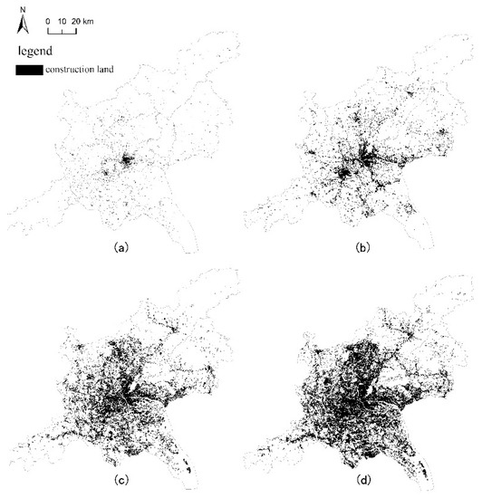 Growth of the built-up area in Guangzhou–Foshan Metropolitan: (a) 1987, (b) 1997, (c) 2007, and (d) 2017. Source: derived from satellite remote sensing maps at: datamirror.csdb.cn/admin/introLandsat.jsp (accessed on 5 March 2018).