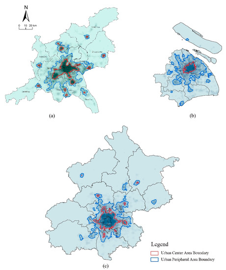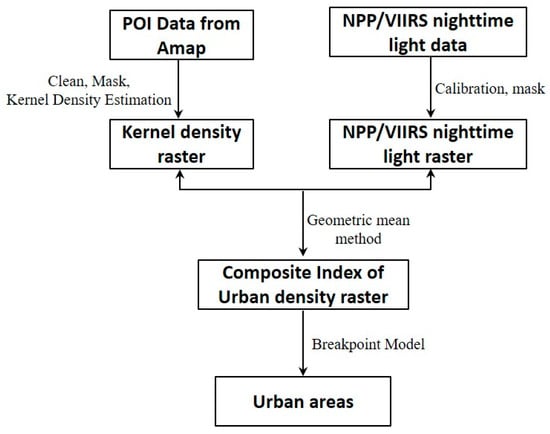 (2) With the gradual penetration and popularization of GIS technology in other disciplines starting from 2000, researchers began to utilize remote sensing image and nighttime light data and proposed a variety of algorithms or models [38,39,40]. Two main research paths were observed during this period. On the one hand, the land use status of a city and its surrounding areas was extracted followed by a calculation of different landscape indexes, based on which the urban areas of a city were defined. On the other hand, urban areas were demarcated according to the employment types and social and economic activities of the urban and rural population or the spatial connection and interaction among urban elements. Compared with the previous stage, the accuracy of urban area identification was greatly improved during this period by using remote sensing images and nighttime light data in the analysis. However, many of the composite models proposed during this period were too complex to be generalized. Specifically, the empirical models developed in one city were often unable to collect the same data from other cities, thereby introducing difficulties in comparing cities based on the same benchmark.