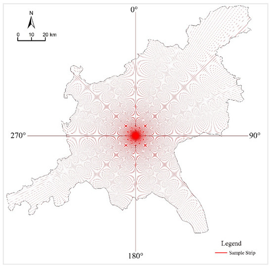 The empirical framework for delineating urban areas based on POI and DMSP/OLS nighttime light data involves four steps (see Figure 3). In the first step, the cleaned POI and NPP/VIIRS nighttime light data were divided according to city administrative boundaries and were integrated by using the mean value method to generate a new POI and NPP index core density map. In the second step, the area to be measured was divided into 360 splines at a 1° interval from the city center, and sampling points were set at 500 m intervals from the direction of no spline from the city center to the edge (see Figure 4). The constructed POI and NPP index values were assigned to each sampling point. In the third step, given that the POI and NPP index (which reflects urban density) gradually decreased from the urban core area to the urban fringe area and then to the rural area, the breakpoint model was used to find out the two breakpoints among these three areas and to connect the adjacent breakpoints into a line. In the fourth step, the area where the lines were aligned was evaluated, and the space units with a spatial discontinuity area of less than 10 km2 were removed to obtain the final result. The key steps are described in the following sections.