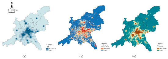 (a) POI kernel density estimation diagram, (b) DMSP/OLS nighttime light data figure, (c) PN composite index of urban density.
