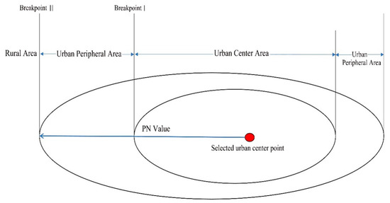 Based on the newly constructed PN composite index, the breakpoint model was used to divide the boundary between urban and rural areas and that between the urban core and urban fringe areas. Introduced by P.D.Converse on W.J. Reilly’s “Law of retail Gravity” in 1949, breakpoint theory examines the interaction between cities and regions [53]. This theory later attracted wide application in dividing the urban attraction scope, and its basic principle is to take the maximum distance attenuation mutation value of the eigenvalue representing the spatial density as the segmentation point of different interfaces within the region [54,55]. Defining the urban boundary based on the breakpoint model follows a critical requirement, that is, the selected high-value eigenvalues should be concentrated in the urban core area, and the eigenvalues from the urban core area to the peripheral rural area should show a gradual downward trend. Empirical experience shows that the spatial distribution of urban POI density and nighttime light intensity satisfies this requirement. After repeated tests, the geographical distribution of the PN composite index satisfied the basic requirements of applying the breakpoint model. The following breaking point formula was used to calculate the catastrophe point of the PN value in each sample [56]:
