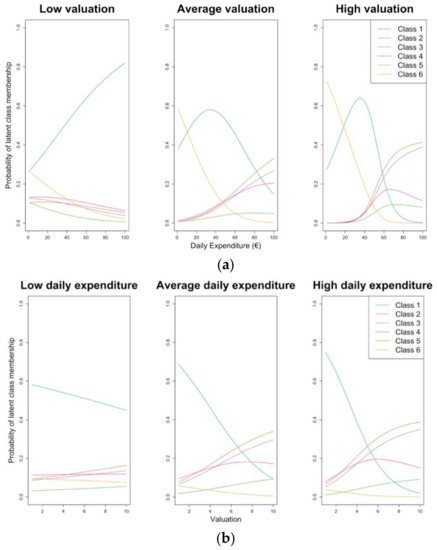 - For intermediate and high valuation, a complex picture emerges. For low to intermediate expenditure profiles, classes 1 and 6 again dominate. However, as the expenditure increases, classes 2 and 3 become more important. Class 4 is also present, with probabilities up to 0.2, at high expenditures in the intermediate valuation range, and at intermediate-to-high expenditures in the high valuation category. Finally, there is a non-negligible contribution (∼0.1) from class 5 for high valuation and high expenditure.